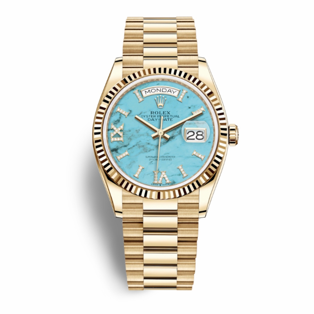 18kt yellow gold case with a 18kt yellow gold rolex president bracelet. Fixed- fluted 18kt yellow gold bezel. Turquoise dial with yellow gold hands and Roman- diamond numeral hour markers. Dial Type: Analog. Date display at the 3 o'clock position. Rolex Calibre 3255 Automatic movement, based upon Rolex 3035, containing 31 Jewels, bitting at 28800 vph, and has a power reserve of approximately 70 hours. Scratch resistant sapphire crystal. Screw down crown. Solid case back. Round case shape. Case size: 36 mm. Folding crown clasp. Water resistant at 100 meters / 330 feet. Functions: date, day, hour, minute, second. Luxury watch style. Watch label: Swiss Made. Rolex Day-Date 36 Turquoise Dial 18kt Yellow Gold President Watch 128238DSP.