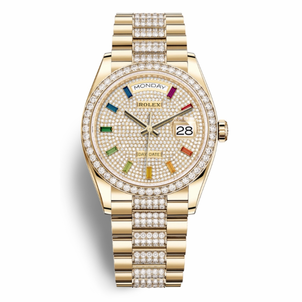 18kt yellow gold case with a 18kt yellow gold diamond-set president bracelet. Fixed diamond set bezel. Diamond pave dial with yellow gold hands and index-Roman numerals hour markers. Dial Type: Analog. Date display at the 3 o'clock position. Rolex Calibre 3255 Automatic movement, based upon Rolex 3035, containing 31 Jewels, bitting at 28800 vph, and has a power reserve of approximately 70 hours. Scratch resistant sapphire crystal. Screw down crown. Solid case back. Round case shape. Case size: 36 mm. Water resistant at 100 meters / 330 feet. Functions: date, day, hour, minute, second. Additional Info: 10 baguette-cut, rainbow-coloured sapphires. Luxury watch style. Watch label: Swiss Made. Rolex Day-Date 36 Paved Dial 18kt Yellow Gold Diamond-Set President Watch 128348DSDP.
