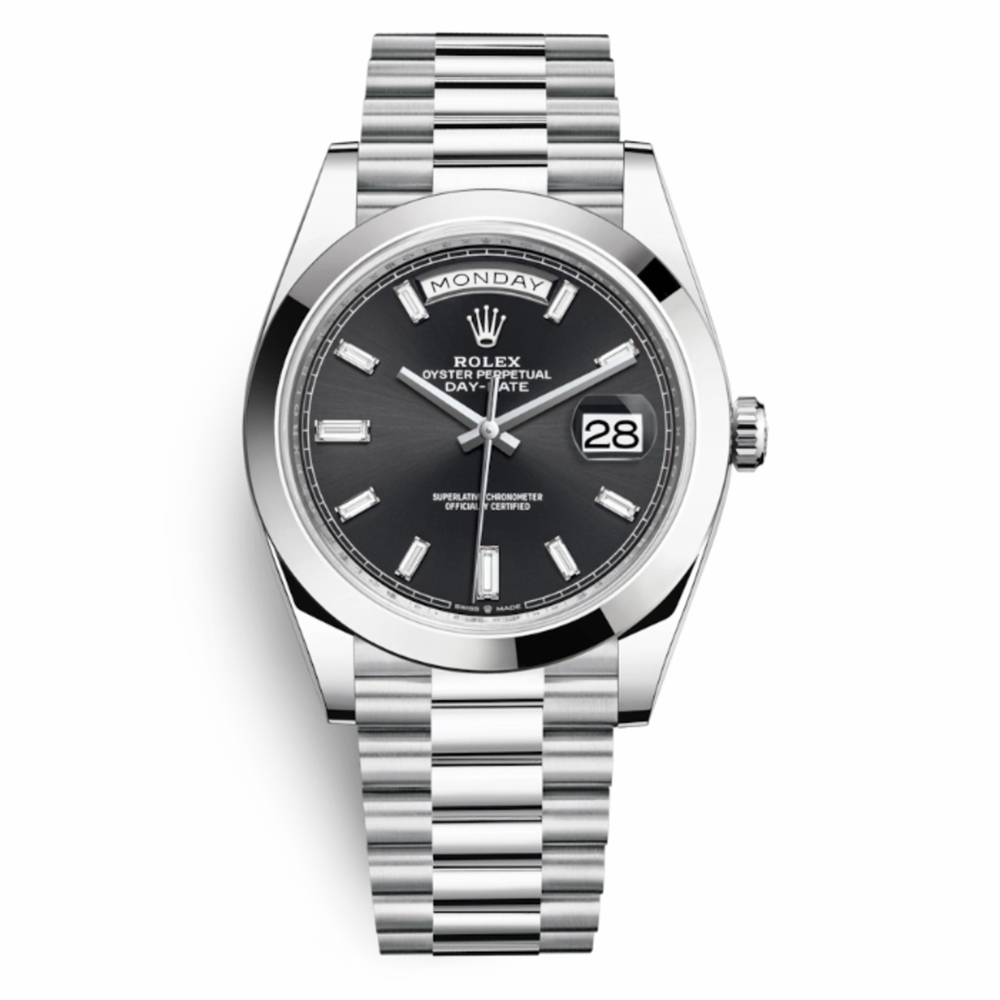 White platinum case with a white platinum rolex president bracelet. Fixed white platinum bezel. Black dial with silver-tone hands and baguette hour markers. Dial Type: Analog. Date display at the 3 o'clock position. Rolex Calibre 3255 Automatic movement, based upon Rolex 3035, containing 31 Jewels, bitting at 28800 vph, and has a power reserve of approximately 70 hours. Scratch resistant sapphire crystal. Screw down crown. Solid case back. Round case shape. Case size: 40 mm. Folding clasp. Water resistant at 100 meters / 330 feet. Functions: date, day, hour, minute, second. Additional Info: 10 baguette-cut diamonds. Luxury watch style. Watch label: Swiss Made. Rolex Day Date 40 Black Diamond Dial Automatic Mens Platinum President Watch 228206BKDP.