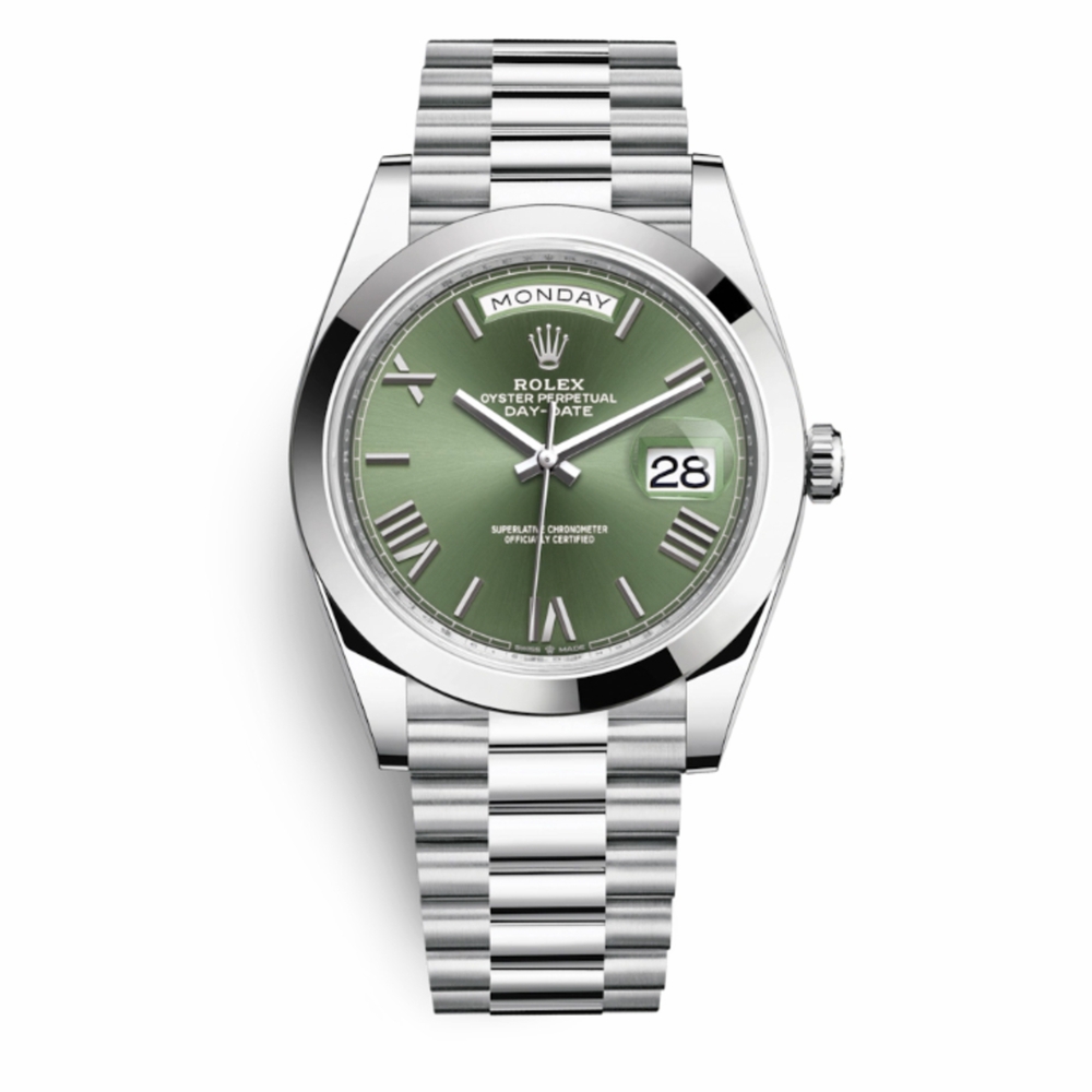 Platinum case with a platinum rolex president bracelet. Fixed platinum bezel. Green dial with silver-tone hands and index and Roman numeral hour markers. Minute markers around the outer rim. Dial Type: Analog. Date display at the 3 o'clock position. day of the week display centered on the 12 o'clock position. Rolex Calibre 3255 Automatic movement, based upon Rolex 3035, containing 31 Jewels, bitting at 28800 vph, and has a power reserve of approximately 70 hours. Scratch resistant sapphire crystal. Screw down crown. Solid case back. Round case shape. Case size: 40 mm. Concealed crown clasp. Water resistant at 100 meters / 330 feet. Functions: date, day, hour, minute, second, chronometer. Luxury watch style. Watch label: Swiss Made. Rolex Day Date 40 Olive Green Dial Automatic Mens Platinum President Watch 228206GNSRP.