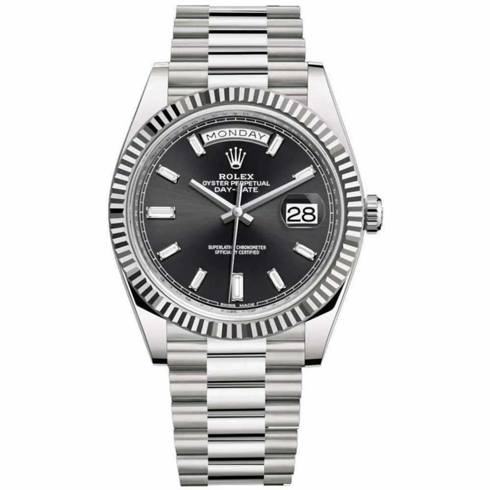 18kt white gold case with a 18kt white gold rolex president bracelet. Fixed-fluted 18kt white gold bezel. Black dial with silver-tone hands and baguette-cut diamonds hour markers. Dial Type: Analog. Date display at the 3 o'clock position. Rolex Calibre 3255 automatic movement with a 70-hour power reserve. Scratch resistant sapphire crystal. Screw down crown. Solid case back. Round case shape. Case size: 40 mm. Water resistant at 100 meters / 330 feet. Functions: date, hour, minute, second. Luxury watch style. Watch label: Swiss Made. Rolex Day-Date 40 Automatic Black Diamond Dial Mens 18K White Gold President Watch 228239BKDP.