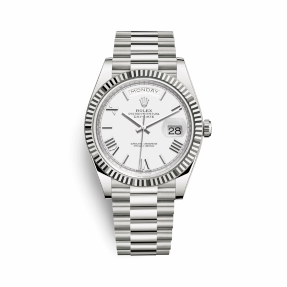 18kt white gold case with a 18kt white gold Rolex president bracelet. Fixed fluted 18kt white gold bezel. White dial with white hands and alternating Roman numeral and index hour markers. Minute markers around the outer rim. Dial Type: Analog. Date display at the 3 o'clock position. Day of the week display at the 12 o' clock position. Rolex calibre 3255 automatic movement, based upon Rolex 3035, containing 31 Jewels, bitting at 28800 vph, and has a power reserve of approximately 70 hours. Scratch resistant sapphire crystal. Screw down crown. Solid case back. Round case shape. Case size: 40 mm. Crown clasp. Water resistant at 100 meters / 330 feet. Functions: date, day, hour, minute, second. Day-date 40 Series. Luxury watch style. Watch label: Swiss Made. Rolex Day-Date 40 White Dial Automatic Mens 18kt White Gold President Watch 228239WRP.