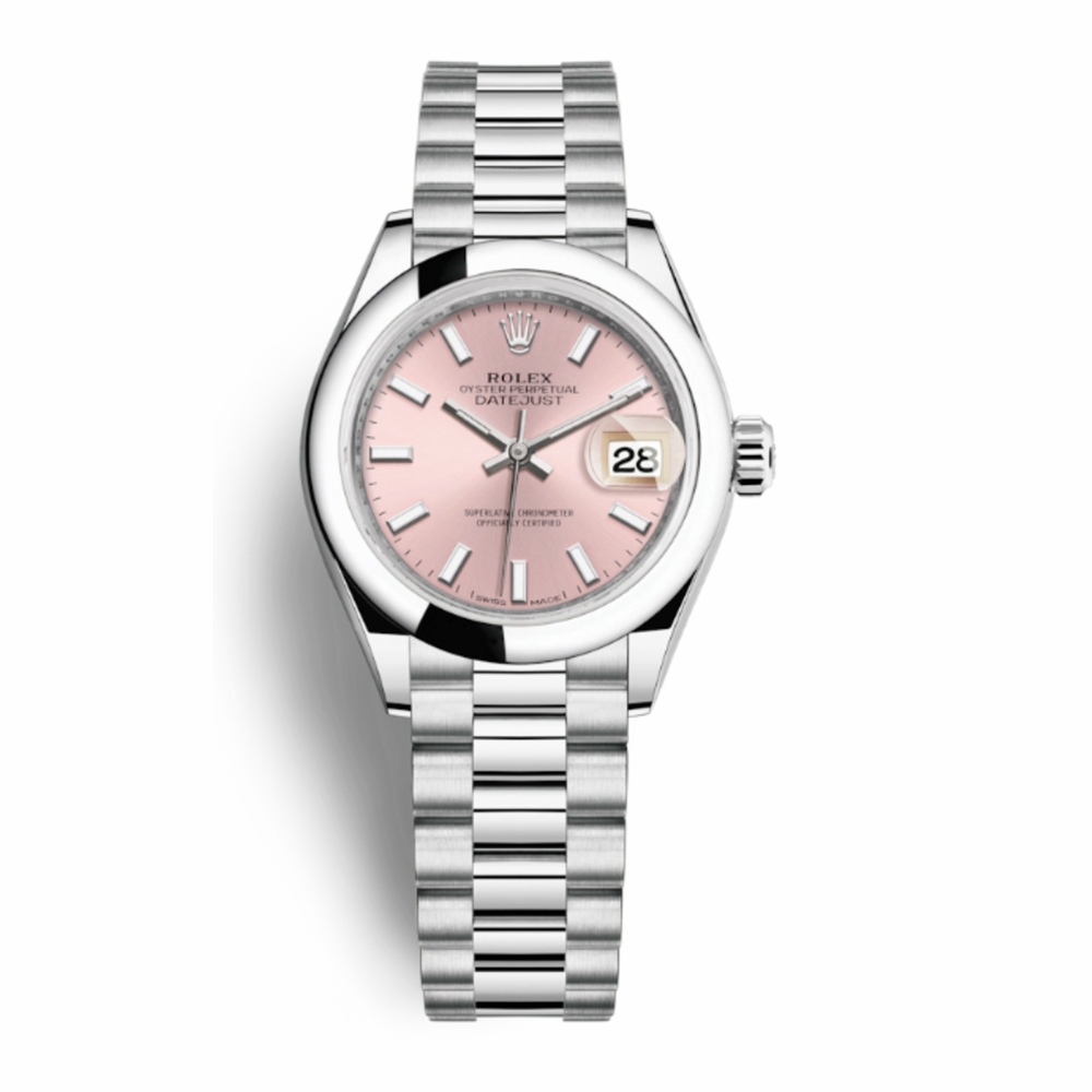 White platinum case with a white platinum rolex president bracelet. Fixed- domed white platinum bezel. Pink dial with silver-tone hands and index hour markers. Minute markers around the outer rim. Dial Type: Analog. Luminescent hands. Date display at the 3 o'clock position. Rolex Calibre 2236 Automatic movement, based upon Rolex 2235, containing 31 Jewels, bitting at 28800 vph, and has a power reserve of approximately 55 hours. Scratch resistant sapphire crystal. Screw down crown. Solid case back. Round case shape, case size: 28 mm. Folding clasp. Water resistant at 100 meters / 330 feet. Functions: date, hour, minute, second. Lady-datejust Series. Luxury watch style. Watch label: Swiss Made. Rolex Lady-Datejust Pink Dial Automatic Platinum President Watch 279166GYRP.
