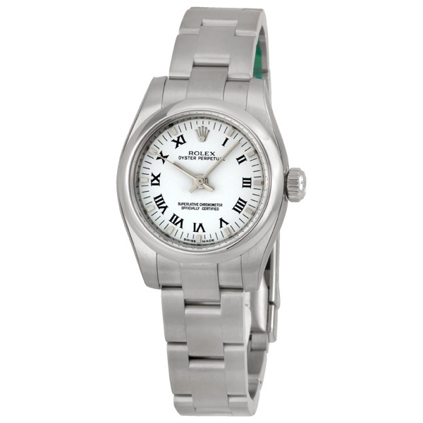 Stainless steel case with a stainless steel Rolex oyster bracelet. Fixed domed stainless steel bezel. White dial with silver-tone hands and Roman numeral / index hour markers. Minute markers around the outer rim. Dial Type: Analog. Luminescent hands and dial markers. Rolex calibre 2230 automatic movement, containing 31 Jewels, bitting at 28800 vph, and has a power reserve of approximately 42 hours. Scratch resistant sapphire crystal. Screw down crown. Solid case back. Round case shape. Case size: 26 mm. Oysterlock clasp. Water resistant at 100 meters / 330 feet. Functions: hour, minute, second, chronometer. Lady Oyster Perpetual 26 Series. Luxury watch style. Watch label: Swiss Made. Rolex Lady Oyster Perpetual 26 White Dial Stainless Steel Oyster Bracelet Automatic Watch 176200WRO.