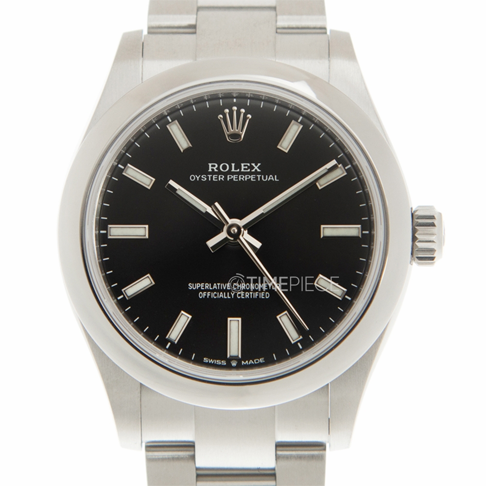 Silver-tone stainless steel case and bracelet. Fixed silver-tone stainless steel bezel. Black dial with silver-tone hands and index hour markers. Minute markers around the outer rim. Dial Type: Analog. Luminescent hands and markers. Rolex Calibre 2232 Automatic movement, containing 31 Jewels, bitting at 28800 vph, and has a power reserve of approximately 55 hours. Scratch resistant sapphire crystal. Screw down crown. Solid case back. Round case shape, case size: 31 mm. Oysterlock clasp. Water resistant at 100 meters / 330 feet. Functions: hour, minute, second, chronometer. Oyster Perpetual 31 Series. Sport watch style. Watch label: Swiss Made. Item Variations: M277200-0002. Rolex Oyster Perpetual 31 Automatic Black Dial Ladies Watch 277200BKSO.