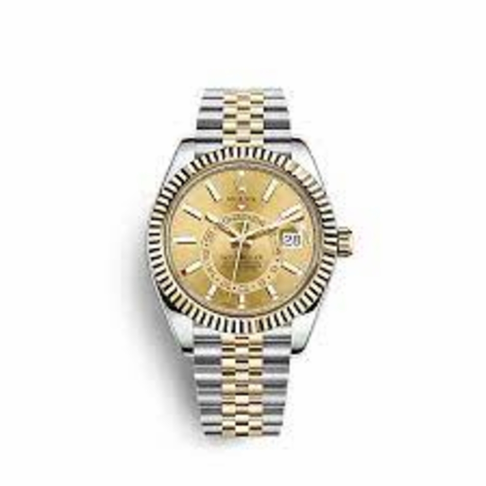 Stainless steel case with a brushed & polished stainless steel and 18kt yellow gold rolex jubilee bracelet. Fluted ring command 18kt yellow gold bezel. Champagne dial with index hour markers. Minute markers around the outer rim. Dial Type: Analog. Luminescent hands and markers. Date display at the 3 o'clock position. One subdial displaying: 24 hour. Rolex Calibre 9001 Automatic movement, containing 40 Jewels, composed of 380 parts, bitting at 28800 vph, and has a power reserve of approximately 72 hours. Scratch resistant sapphire crystal. Screw down crown. Solid case back. Round case shape, case size: 42 mm. Oysterlock clasp. Water resistant at 100 meters / 330 feet. Functions: annual calendar, month, date, GMT, second time zone, hour, minute, second, chronometer. Oyster Perpetual Sky-dweller Series. Luxury watch style. Watch label: Swiss Made. Rolex Oyster Perpetual Sky-Dweller Automatic Chronometer Champagne Dial Mens Watch 326933CSJ.