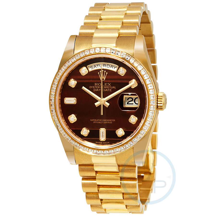 18kt yellow gold case with a 18kt yellow gold rolex president bracelet. Fixed 18kt yellow gold set with diamonds bezel. Chocolate bulls eye dial with yellow gold hands and diamonds hour markers. Baguette diamonds mark the 6 and 9 o'clock positions. Dial Type: Analog. Date display at the 3 o'clock position, day of the week display at the 12 o' clock. Rolex Calibre 3155 automatic movement with a 48-hour power reserve. Scratch resistant sapphire crystal. Screw down crown. Solid case back. Round case shape. Case size: 36 mm. Hideen clasp. Water resistant at 100 meters / 330 feet. Functions: date, day, hour, minute, second, chronometer. Luxury watch style. Watch label: Swiss Made. Rolex Day-Date Chocolate Bulls Eye Diamond Dial Automatic Mens 18kt Yellow Gold President Watch 118398CHBEDP.