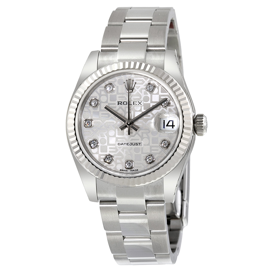 Stainless steel case with a stainless steel Rolex oyster bracelet. Fixed - fluted 18kt white gold bezel. Silver jubilee dial with silver-tone hands and diamond hour markers. Dial Type: Analog. Date display at the 3 o'clock position. Rolex Calibre 2235 automatic movement with about 48 hours of power reserve. Scratch resistant sapphire crystal. Screw down crown. Solid case back. Case size: 31 mm. Round case shape. Oysterlock clasp. Water resistant at 100 meters / 330 feet. Functions: date, hour, minute, second, chronometer. Luxury watch style. Watch label: Swiss Made. Rolex Datejust Lady 31 Silver Jubilee Dial Stainless Steel Rolex Oyster Automatic Watch 178274SJDO.