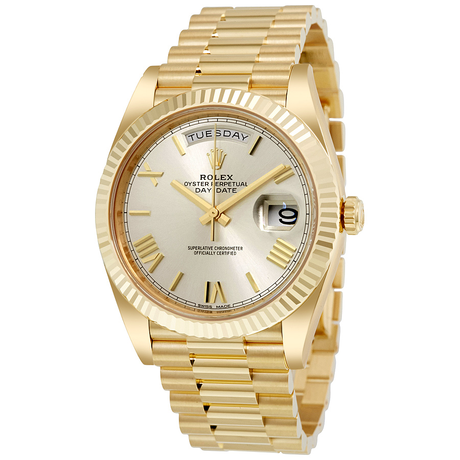 18kt yellow gold case with a 18kt yellow gold Rolex president bracelet. Fixed fluted 18kt yellow gold bezel. Silver dial with yellow gold hands and alternating index and Roman numeral hour markers. Minute markers around the outer rim. Dial Type: Analog. Date display at the 3 o'clock position. Day of the week display centered on the 12 o'clock positions. Rolex calibre 3255 automatic movement, based upon Rolex 3035, containing 31 Jewels, bitting at 28800 vph, and has a power reserve of approximately 70 hours. Scratch resistant sapphire crystal. Screw down crown. Solid case back. Round case shape. Case size: 40 mm. Concealed crown clasp. Water resistant at 100 meters / 330 feet. Functions: date, day, hour, minute, second, chronometer. Day-date 40 Series. Luxury watch style. Watch label: Swiss Made. Rolex Day-Date 40 Silver Dial 18K Yellow Gold President Mens Watch 228238SSRP.
