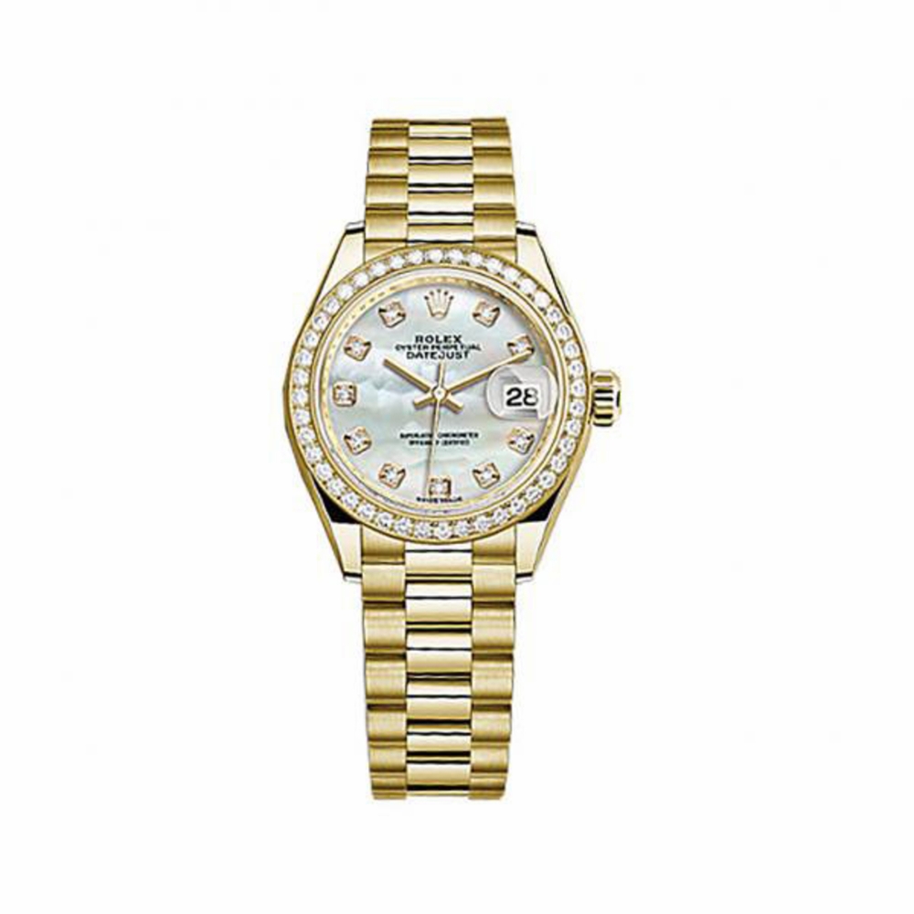 18 carat yellow gold case with a 18 carat yellow gold president bracelet. Fixed-diamond set bezel. Mother of pearl dial with gold-tone hands and diamond hour markers. Dial Type: Analog. Date display at the 3 o'clock position. Rolex Calibre 2236 automatic movement with about 55 hours of power reserve. Scratch resistant sapphire crystal. Screw down crown. Solid case back. Case size: 28 mm. Round case shape. Water resistant at 100 meters / 330 feet. Functions: date, hour, minute, second. Luxury watch style. Watch label: Swiss Made. Rolex Lady-Datejust Mother Of Pearl Dial Automatic 18 Carat Yellow Gold Watch 279138MDP.