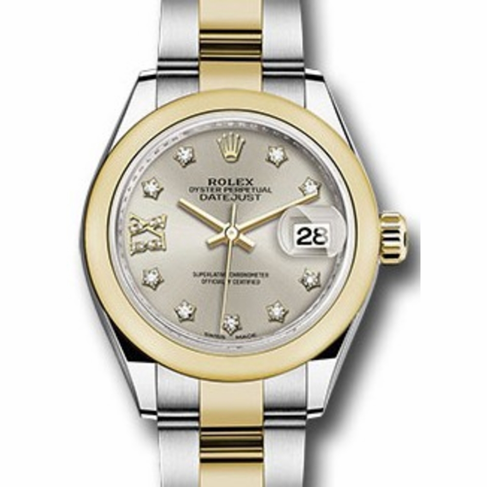 Stainless steel and 18k yellow gold case with a stainless steel and 18k yellow gold rolex oyster bracelet. Fixed bezel. Silver dial with gold-tone hands and diamond- Roman numeral at the 9 o' clock hour markers. Dial Type: Analog. Date display at the 3 o'clock position. Rolex Calibre 2236 automatic movement with about 55 hours of power reserve. Scratch resistant sapphire crystal. Screw down crown. Solid case back. Case size: 28 mm. Round case shape. Water resistant at 100 meters / 330 feet. Functions: date, hour, minute, second. Luxury watch style. Watch label: Swiss Made. Rolex Lady Datejust 28 Silver Dial Steel and 18K Yellow Gold Watch 279163SRDO.