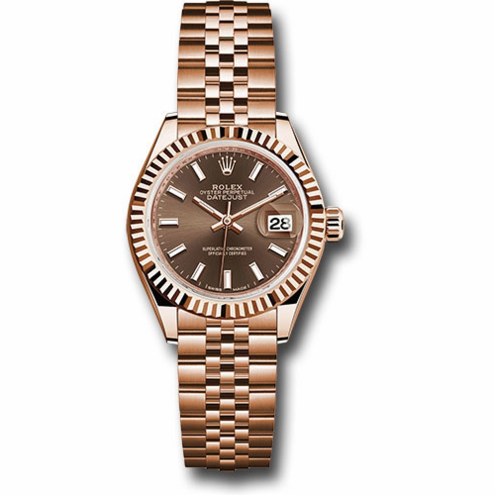 18k everose gold case with a 18k everose gold Rolex Jubilee bracelet. Fixed, fluted 18k everose bezel. Chocolate dial with rose gold-tone hands and index hour markers. Minute markers around the outer rim. Dial Type: Analog. Date display at the 3 o'clock position. Rolex Calibre 2236 automatic movement with about 55 hours of power reserve. Scratch resistant sapphire crystal. Screw down crown. Solid case back. Case size: 28 mm. Round case shape. Water resistant at 100 meters / 330 feet. Functions: date, hour, minute, second. Luxury watch style. Watch label: Swiss Made. Rolex Lady Datejust Chocolate Dial 18K Everose Gold Automatic Watch 279175CHSJ.