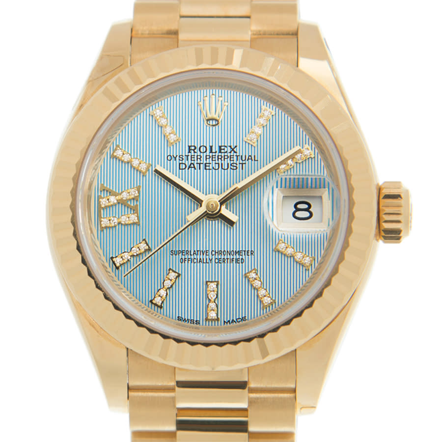 18 carat yellow gold case with a 18 carat yellow gold president bracelet. Fluted bezel. Cornflower blue dial with gold-tone hands and diamond- filled index hour markers. Dial Type: Analog. Date display at the 3 o'clock position. Rolex Calibre 2236 automatic movement with about 55 hours of power reserve. Scratch resistant sapphire crystal. Screw down crown. Solid case back. Case size: 28 mm. Round case shape. Water resistant at 100 meters / 330 feet. Functions: date, hour, minute, second. Luxury watch style. Watch label: Swiss Made. Rolex Oyster Perpetual Datejust Cornflower Blue Dial Automatic 18 Carat Yellow Gold Ladies Watch 279178CFBLSRDP.