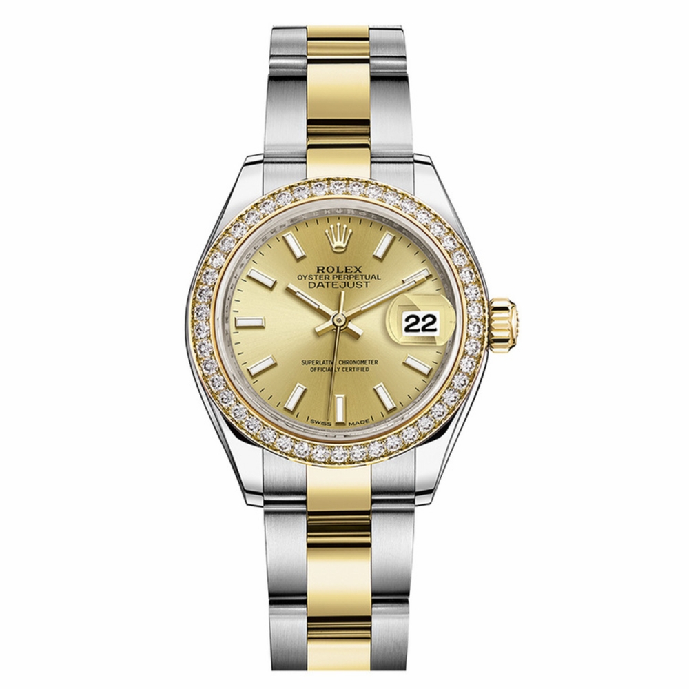 Stainless steel and 18k yellow gold case with a stainless steel and 18k yellow gold Rolex Oyster bracelet. Fixed, diamond-set bezel. Champagne dial with yellow gold-tone hands and index hour markers. Dial Type: Analog. Date display at the 3 o'clock position. Automatic movement. Scratch resistant sapphire crystal. Solid case back. Case size: 28 mm. Round case shape. Concealed crown clasp. Water resistant at 100 meters / 330 feet. Functions: date, hour, minute, second. Luxury watch style. Watch label: Swiss Made. Rolex Lady Datejust Champagne Dial Diamond Bezel Automatic Watch 279383CSO.