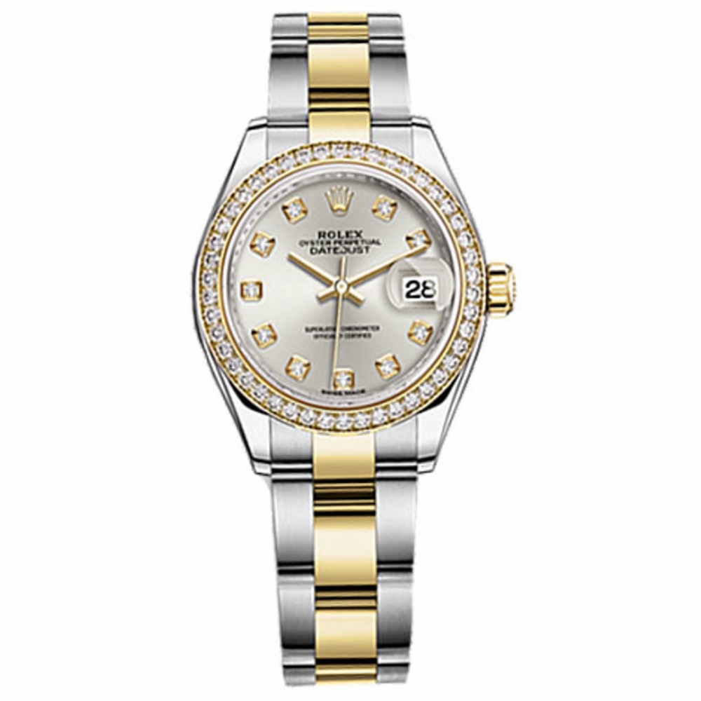Stainless steel and 18k yellow gold case with a stainless steel and 18k yellow gold Rolex Oyster bracelet. Fixed 18k yellow gold diamond-set bezel. Silver dial with yellow gold-tone hands and diamond hour markers. Dial Type: Analog. Date display at the 3 o'clock position. Automatic movement. Scratch resistant sapphire crystal. Screw down crown. Case size: 28 mm. Round case shape. Oysterlock clasp. Water resistant at 100 meters / 330 feet. Functions: date, hour, minute, second. Luxury watch style. Watch label: Swiss Made. Rolex Lady Datejust Silver Dial Steel and 18K Yellow Gold Diamond Oyster Watch 279383SDO.