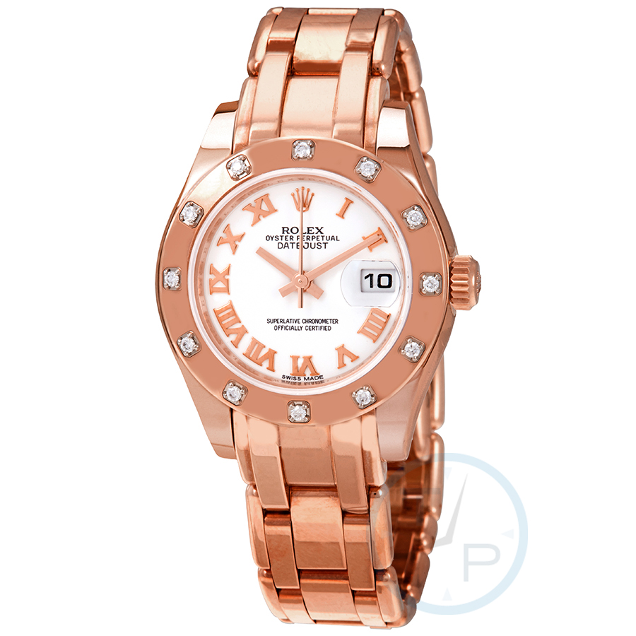 18k everose gold case with a 18k everose gold rolex pearlmaster bracelet. Fixed with diamonds bezel. White dial with rose gold-tone hands and Roman numeral hour markers. Dial Type: Analog. Date display at the 3 o'clock position. Automatic movement. 2235 engine. Scratch resistant sapphire crystal. Screw down crown. Solid case back. Case diameter: 29 mm. Round case shape. Concealed crown clasp. Water resistant at 100 meters / 330 feet. Functions: date, hour, minute, second. Luxury watch style. Watch label: Swiss Made. Rolex Lady-Datejust Pearlmaster White Dial 18K Everose Gold Automatic Ladies Watch 80315WRPM.
