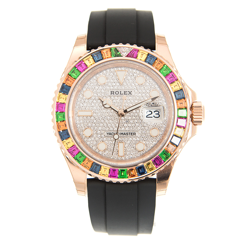 18kt rose gold case with a rubber oysterflex strap. Rainbow sapphire diamond set bezel. Diamond set dial with diamond hour markers. Dial Type: Analog. Date display at the 3 o'clock position. Rolex Calibre 3135 automatic movement with a 48-hour power reserve. Scratch resistant sapphire crystal. Screw down crown. Solid case back. Round case shape. Case size: 40 mm. Oysterlock clasp. Water resistant at 100 meters / 330 feet. Functions: date, hour, minute, second, chronometer. Dress watch style. Watch label: Swiss Made.