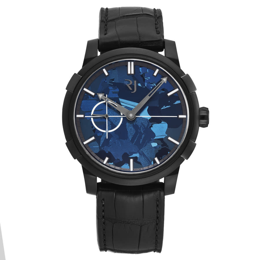 Black stainless steel case with a black leather strap. Fixed black stainless steel bezel. Blue dial with black hands and index hour markers. Minute markers around the outer rim. Dial Type: Analog. RJ003-A automatic movement. Scratch resistant sapphire crystal. Screw down crown. Solid case back. Round case shape, case size: 43 mm, case thickness: 11 mm. Band width: 21 mm, band length: 8 inches. Buckle clasp. Water resistant at 30 meters / 100 feet. Functions: hour, minute, second. Additional Info: hour, minute, second. 1969 Series. Luxury watch style. Watch label: Swiss Made. Romain Jerome 1969 Automatic Blue Dial Mens Watch RJ.M.AU.020.09.