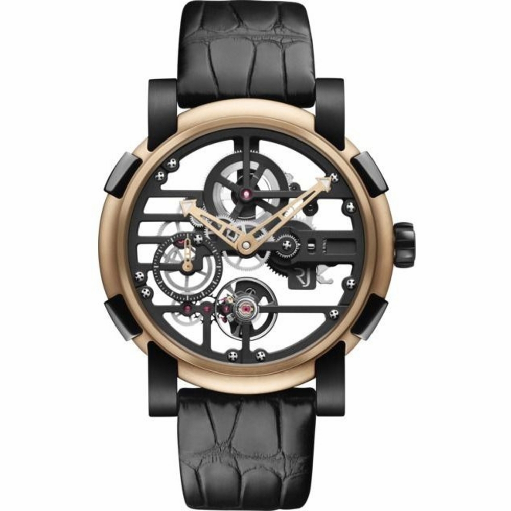 18 carat rose gold case with a black leather strap. Fixed bezel. Skeleton dial with rose gold-tone hands. Dial Type: Analog. Luminescent hands. Romain Jerome Calibre RJ004-M automatic movement with about 48 hours of power reserve. Scratch resistant sapphire crystal. Skeleton transparent exhibition see through case back. Case size: 38 mm. Round case shape. Water resistant at 30 meters / 100 feet. Functions: hour, minute. Luxury watch style. Watch label: Swiss Made. Romain Jerome Skylab 48 Red Automatic Mens Watch RJ.M.AU.031.02.