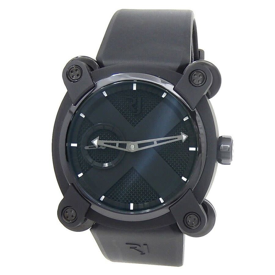 Black PVD stainless steel case with a black rubber strap. Fixed black stainless steel bezel. Black dial with grey-toned hands and index hour markers. Minute markers around the outer rim. Dial Type: Analog. Small seconds sub-dial subdials. Romain Jerome Calibre RJ001-CS automatic movement with a 42-hour power reserve. Scratch resistant sapphire crystal. Round case shape. Case size: 46 mm. Functions: hour, minute, second. Additional Info: case is composed of spare parts from apollo 11. Dress watch style. Watch label: Swiss Made. Item Variations: RJ M AU IN 001 01, RJ-M-AU-IN-001-01, RJ/M/AU/IN/001/01, RJMAUIN00101. Romain Jerome Moon Invader Automatic Black Dial Black Rubber Mens Watch RJ.M.AU.IN.001.01.