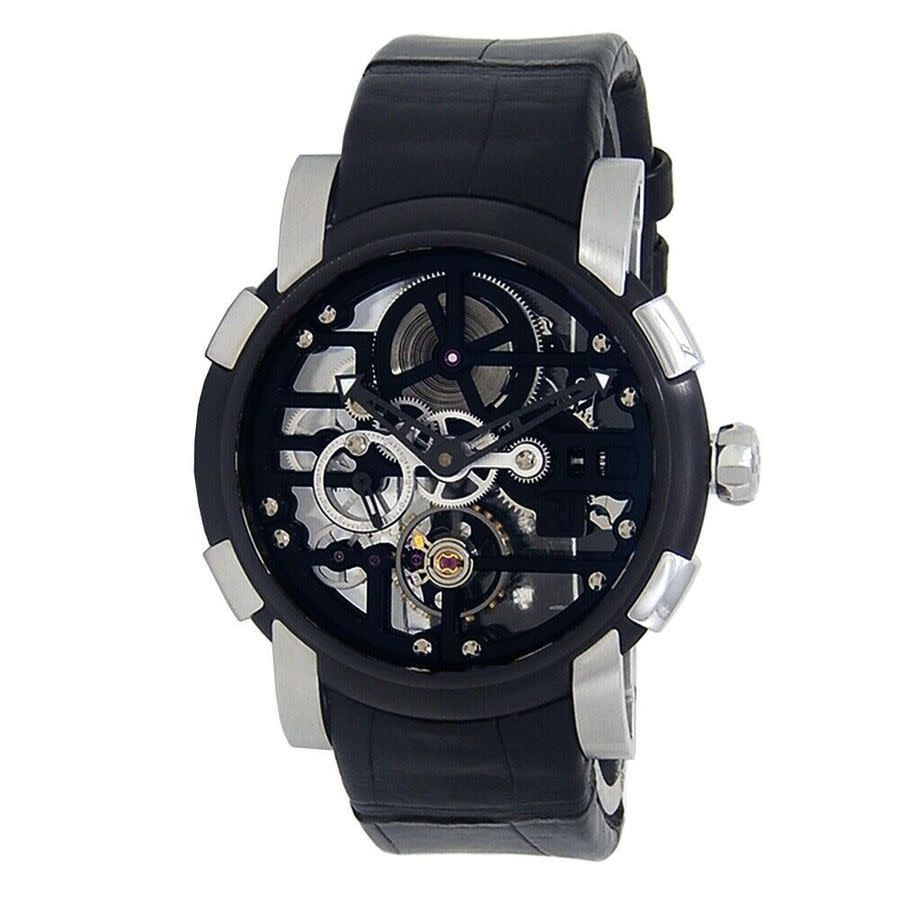 Silver-tone stainless steel case with a black alligator leather strap. Fixed black PVD-coated stainless steel bezel. Black chrome skeleton dial with skeleton black-tone arrow-shaped hands. Dial Type: Analog. One subdial displaying: small second. Romain Jerome Calibre RJ004-M Hand Wind movement, containing 21 Jewels, bitting at 28800 vph, and has a power reserve of approximately 48 hours. Scratch resistant sapphire crystal. Pull / push crown. Skeleton transparent exhibition see through case back. Round case shape, case size: 44 mm. Tang clasp. Water resistant at 30 meters / 100 feet. Functions: hour, minute, small second. Additional Info: limited edition of 99 pieces. Moon-dna Skylab 44 Series. Luxury watch style. Romain Jerome Moon-dna Skylab 44 Black Chrome Skeleton Dial Mens Watch RJMAU02501.