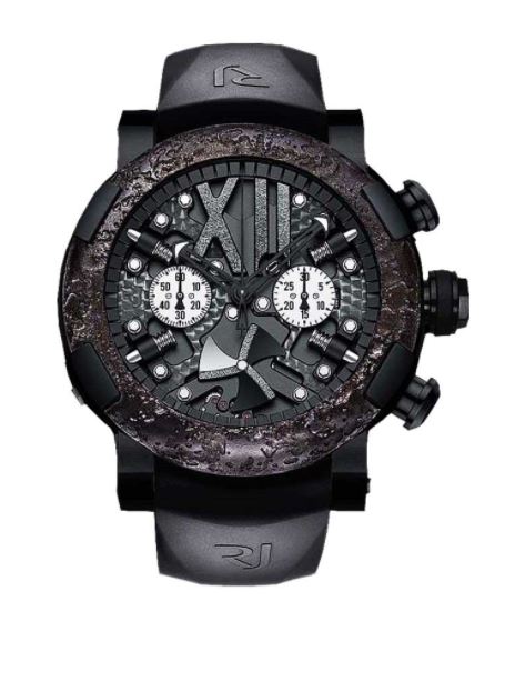 Steel and black PVD-coated steel case with a black rubber strap. Fixed stabilized titanic rusted steel bezel. Black dial with steel hands. Roman numerals marks the 12 o'clock position. minute markers around the outer rim. Dial Type: Analog. Luminescent hands. Chronograph - two sub-dials displaying: 60 second and 30 minute. Calibre RJ001-CS automatic movement with about 42 hours of power reserve. Scratch resistant sapphire crystal. Screw down crown. Solid case back. Case size: 50 mm. Round case shape. Deployment with push button clasp. Water resistant at 30 meters / 100 feet. Functions: chronograph, hour, minute, second. Luxury watch style. Watch label: Swiss Made. Item Variations: RJ T CH SP 002 01, RJ-T-CH-SP-002-01, RJ/T/CH/SP/002/01, RJTCHSP00201. Romain Jerome Titanic-DNA Steampunk Black Chrono Mens Watch RJ.T.CH.SP.002.01.
