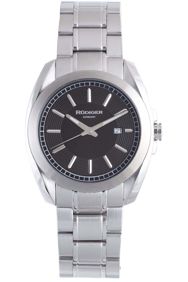 Silver-tone stainless steel case with a silver stainless steel bracelet. Fixed silver-tone stainless steel bezel. Black dial with silver-tone hands and index hour markers. Minute markers around the outer rim. Dial Type: Analog. Date display at the 3 o'clock position. Quartz movement. Scratch resistant mineral crystal. Push/pull crown. Solid case back. Round case shape, case size: 41 mm, case thickness: 12 mm. Band width: 21 mm, band length: 8.5 in. Fold over clasp. Water resistant at 50 meters / 165 feet. Functions: date, hour, minute, second. Casual watch style. Rudiger Dresden Black Dial Mens Watch R1001-04-007.