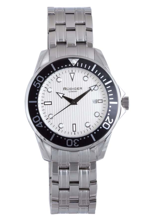 Silver-tone stainless steel case with a silver stainless steel bracelet. Unidirectional rotating silver-tone stainless steel bezel. White dial with black hands and index hour markers. Minute markers around the outer rim. Dial Type: Analog. Quartz movement. Scratch resistant mineral crystal. Push/pull crown. Solid case back. Round case shape, case size: 42 mm, case thickness: 11.5 mm. Band width: 20 mm, band length: 8.5 in. Fold over clasp. Water resistant at 50 meters / 165 feet. Functions: hour, minute, second. Casual watch style. Rudiger Chemnitz White Dial Mens Watch R2000-04-001.