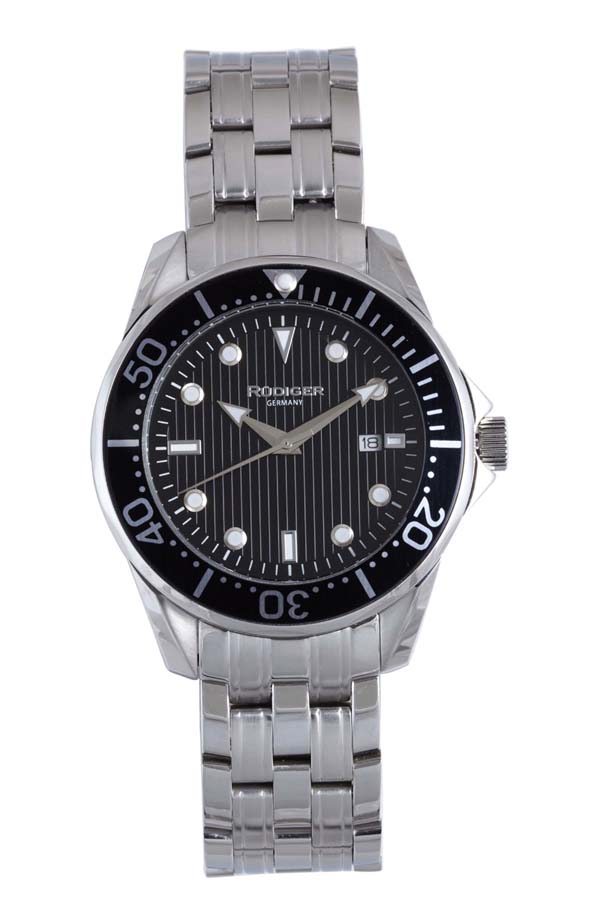 Silver-tone stainless steel case with a silver stainless steel bracelet. Unidirectional rotating silver-tone stainless steel bezel. Black dial with silver-tone hands and index hour markers. Minute markers around the outer rim. Dial Type: Analog. Date display at the 3 o'clock position. Quartz movement. Scratch resistant mineral crystal. Push/pull crown. Solid case back. Round case shape, case size: 42 mm, case thickness: 11.5 mm. Band width: 20 mm, band length: 8.5 in. Fold over clasp. Water resistant at 50 meters / 165 feet. Functions: date, hour, minute, second. Casual watch style. Rudiger Chemnitz Black Dial Mens Watch R2000-04-007.