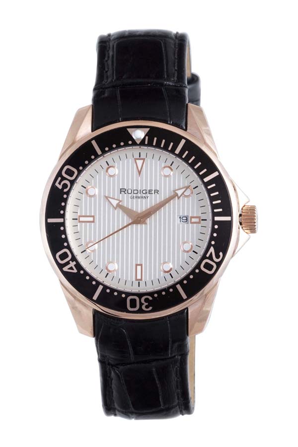Rose gold-tone stainless steel case with a black leather strap. Unidirectional rotating rose gold-tone stainless steel bezel. White dial with rose gold-tone hands and index hour markers. Minute markers around the outer rim. Dial Type: Analog. Date display at the 3 o'clock position. Quartz movement. Scratch resistant mineral crystal. Push/pull crown. Solid case back. Round case shape, case size: 42 mm, case thickness: 11.5 mm. Band width: 20 mm, band length: 8.5 in. Buckle clasp. Water resistant at 50 meters / 165 feet. Functions: date, hour, minute, second. Casual watch style. Rudiger Chemnitz White Dial Mens Watch R2000-09-001L.