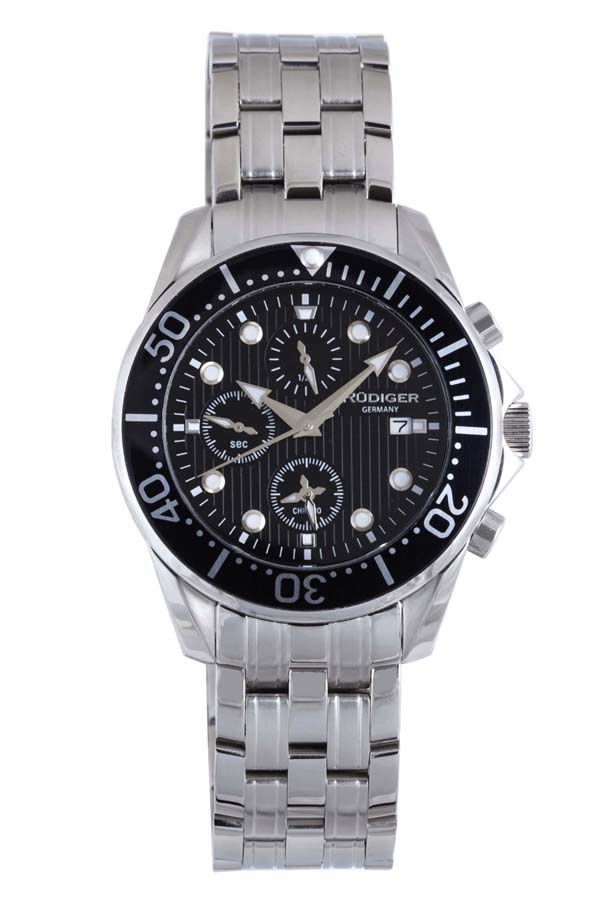 Silver-tone stainless steel case with a silver stainless steel bracelet. Unidirectional rotating silver-tone stainless steel bezel. Black dial with silver-tone hands and index hour markers. Minute markers around the outer rim. Dial Type: Analog. Date display at the 3 o'clock position. Chronograph - three sub-dials displaying: chrono, 60 seconds and 1/20th of a second. Quartz movement. Scratch resistant mineral crystal. Push/pull crown. Solid case back. Round case shape, case size: 42 mm, case thickness: 11.5 mm. Band width: 20 mm, band length: 8.5 in. Fold over clasp. Water resistant at 50 meters / 165 feet. Functions: chronograph, hour, minute, second, date. Casual watch style. Rudiger Chemnitz Chronograph Black Dial Mens Watch R2001-04-007.