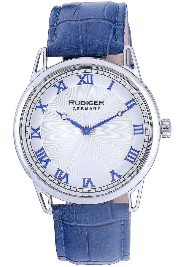 Silver-tone stainless steel case with a blue leather strap. Fixed silver-tone stainless steel bezel. Silver dial with blue hands and Roman numeral hour markers. Minute markers around the outer rim. Dial Type: Analog. Quartz movement. Scratch resistant mineral crystal. Push/pull crown. Solid case back. Round case shape, case size: 42 mm, case thickness: 12 mm. Band width: 21 mm, band length: 8.5 in. Buckle clasp. Water resistant at 50 meters / 165 feet. Functions: hour, minute, second. Casual watch style. Rudiger Ulm Silver Dial Mens Watch R2800-04-001.3.