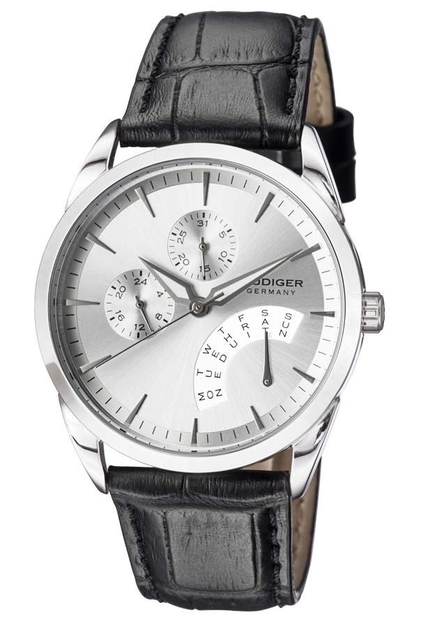 Silver-tone stainless steel case with a black leather strap. Fixed silver-tone stainless steel bezel. Silver dial with silver-tone hands and index hour markers. Minute markers around the outer rim. Dial Type: Analog. Three - 24 hours, day and date subdials. Quartz movement. Scratch resistant mineral crystal. Push/pull crown. Solid case back. Round case shape, case size: 39 mm, case thickness: 9.5 mm. Band width: 21 mm, band length: 8.5 in. Buckle clasp. Water resistant at 50 meters / 165 feet. Functions: date, day, hour, minute, second. Casual watch style. Rudiger Hamelin Silver Dial Mens Watch R3200-04-001.7.