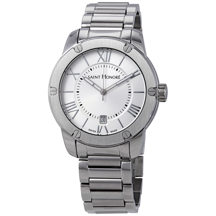Silver-tone stainless steel case with a silver-tone stainless steel bracelet. Fixed silver-tone stainless steel bezel. Silver dial with silver-tone hands and Roman numeral and index hour markers. Minute scale around the inner rim. Dial Type: Analog. Luminescent hands. Date display at the 6 o'clock position. Quartz movement. Scratch resistant sapphire crystal. Pull / push crown. Solid case back. Round case shape. Case size: 42 mm. Deployment clasp. Water resistant at 50 meters / 165 feet. Functions: date, hour, minute, second. Casual watch style. Watch label: Swiss Made. Saint Honore Artcode Silver Dial Mens Watch 861130 1ARAN.