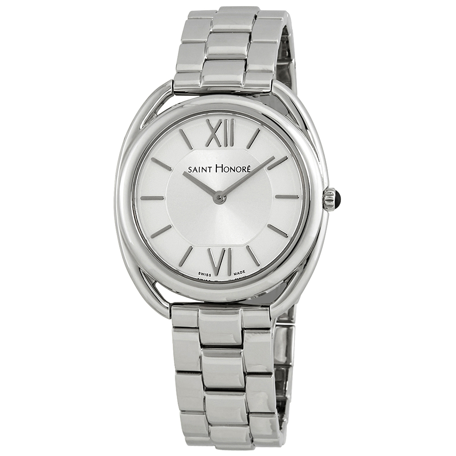 Stainless steel case with a stainless steel bracelet. Fixed stainless steel bezel. Silver dial with silver-tone hands and index hour markers. Roman numerals mark the 6 and 12 o'clock positions. Dial Type: Analog. Quartz movement. Scratch resistant sapphire crystal. Pull / push crown. Solid case back. Round case shape. Case size: 35 mm. Deployment clasp. Water resistant at 30 meters / 100 feet. Functions: hour, minute. Charisma Series. Casual watch style. Watch label: Swiss Made. Saint Honore Charisma Silver Dial Ladies Watch 721122 1AIN.