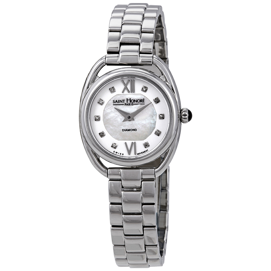 Silver-tone stainless steel case with a silver-tone stainless steel bracelet. Fixed silver-tone stainless steel bezel. White mother of pearl dial with silver-tone hands and diamond and Roman numeral hour markers. Dial Type: Analog. Quartz movement. Scratch resistant sapphire crystal. Pull / push crown. Solid case back. Round case shape. Case size: 26 mm. Water resistant at 30 meters / 100 feet. Functions: hour, minute. Additional Info: 10 diamonds si2/h 0.04 cts 0,80 mm on dial. Dress watch style. Watch label: Swiss Made. Saint Honore Charisma Diamond White Mother of Pearl Dial Ladies Watch 721124 1YADN.