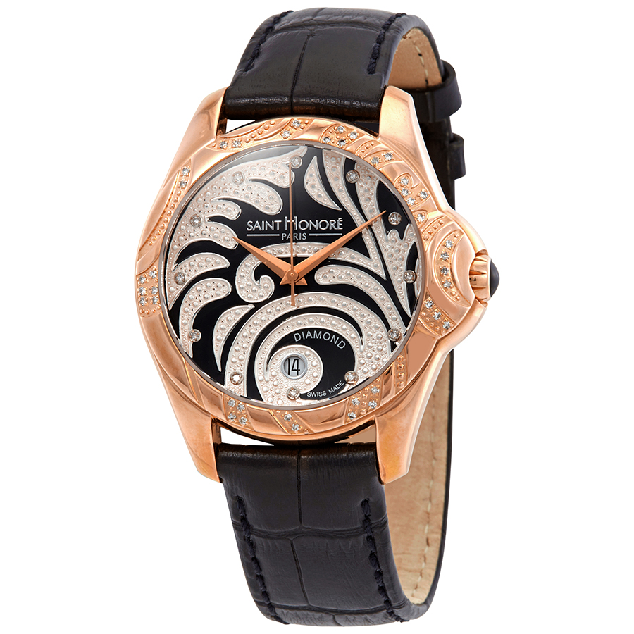 Rose gold-tone stainless steel case with a black leather strap. Fixed rose gold-tone stainless steel bezel. Black dial with rose gold-tone hands and diamond hour markers. Dial Type: Analog. Date display at the 6 o'clock position. Quartz movement. Scratch resistant sapphire crystal. Pull / push crown. Solid case back. Round case shape. Case size: 38 mm. Deployment clasp. Water resistant at 30 meters / 100 feet. Functions: date, hour, minute, second. Dress watch style. Watch label: Swiss Made. Saint Honore Coloseo Diamond Black Dial Ladies Watch 766050 8NFD.