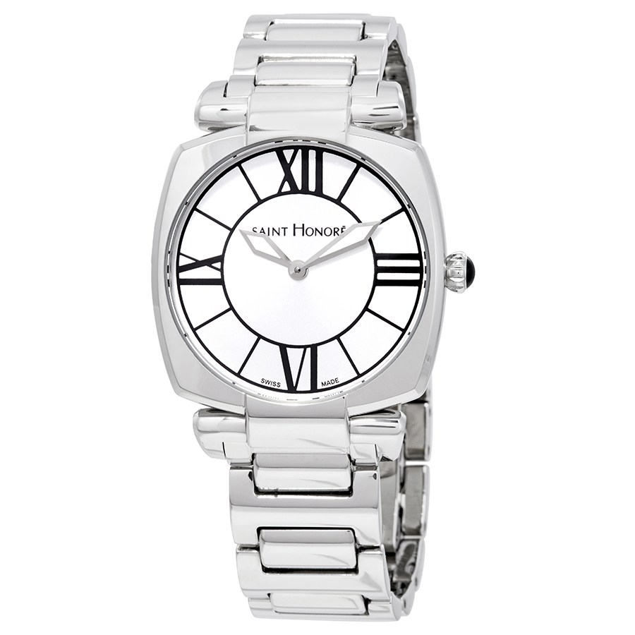 Stainless steel case with a stainless steel bracelet. Fixed stainless steel bezel. Silver dial with luminous silver-tone hands and index hour markers. Roman numerals mark the 3, 6, 9 and 12 o'clock positions. Dial Type: Analog. Luminescent hands. Quartz movement. Scratch resistant sapphire crystal. Pull / push crown. Solid case back. Cushion case shape. Case size: 35 mm. Fold over clasp. Water resistant at 30 meters / 100 feet. Functions: hour, minute. Euphoria Series. Casual watch style. Watch label: Swiss Made. Saint Honore Euphoria Silver Dial Ladies Watch 7211081AR.