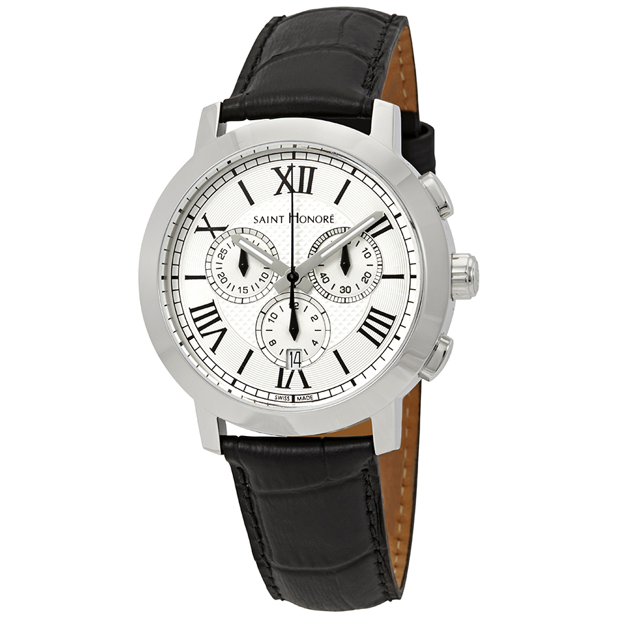 Stainless steel case with a black leather strap. Fixed stainless steel bezel. White dial with luminous silver-tone hands and Roman numeral and index hour markers. Minute markers around the outer rim. Dial Type: Analog. Luminescent hands. Date display at the 6 o'clock position. Chronograph - three sub-dials displaying: 60 second, 30 minute and 12 hour. Quartz movement. Scratch resistant sapphire crystal. Pull / push crown. Solid case back. Round case shape. Case size: 41 mm. Band width: 20 mm. Tang clasp. Water resistant at 30 meters / 100 feet. Functions: chronograph, date, hour, minute, second. Trocadero Series. Sport watch style. Watch label: Swiss Made. Saint Honore Trocadero Chronograph White Dial Mens Watch 8860201ARF.