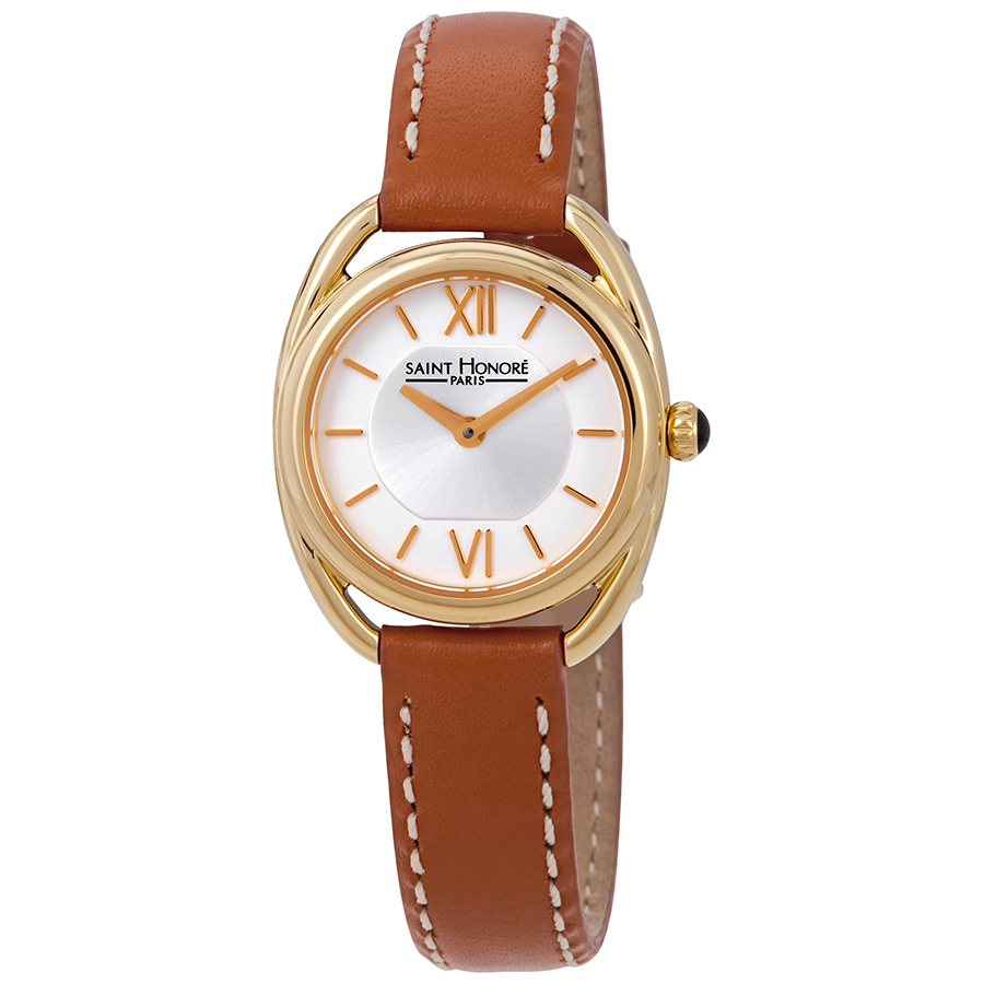 Gold-tone PVD stainless steel case with a leather strap. Fixed gold-tone PVD stainless steel bezel. Silver-tone dial with gold-tone hands and Roman numeral and index hour markers. Dial Type: Analog. Quartz movement. Scratch resistant sapphire crystal. Pull / push crown. Solid case back. Round case shape. Case size: 26 mm. Buckle clasp. Water resistant at 30 meters / 100 feet. Functions: hour, minute. Casual watch style. Watch label: Swiss Made. Saint Honore Charisma Silver Dial Ladies Watch 721024 3AIT-BO.