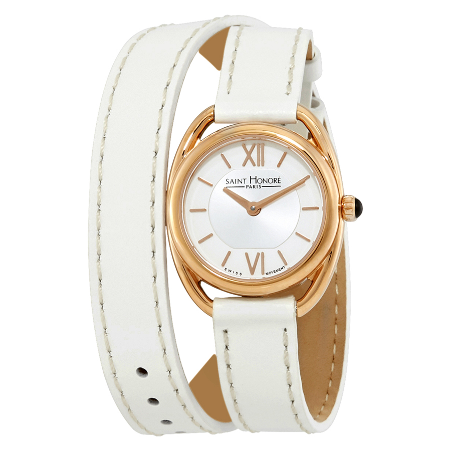 Rose gold-tone stainless steel case with a white leather strap. Fixed rose gold-tone stainless steel bezel. Silver-tone dial with rose gold-tone hands and Roman numeral and index hour markers. Dial Type: Analog. Quartz movement. Scratch resistant sapphire crystal. Pull / push crown. Solid case back. Round case shape. Case size: 26 mm. Buckle clasp. Water resistant at 30 meters / 100 feet. Functions: hour, minute. Dress watch style. Watch label: Swiss Made. Saint Honore Charisma Silver Dial Ladies Watch 721524 8AIR-BB.