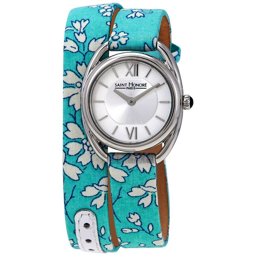 Stainless steel case with a turquoise (floral print) leather (double wrap) strap. Fixed stainless steel bezel. Silver dial with silver-tone hands and index hour markers. Roman numerals mark the 6 and 12 o'clock positions. Dial Type: Analog. Quartz movement. Scratch resistant sapphire crystal. Pull / push crown. Solid case back. Round case shape. Case size: 26 mm. Band width: 10 mm. Tang clasp. Water resistant at 30 meters / 100 feet. Functions: hour, minute. Charisma Series. Dress watch style. Watch label: Swiss Made. Saint Honore Charisma Silver Dial Ladies Watch 721544 1AIN-G.