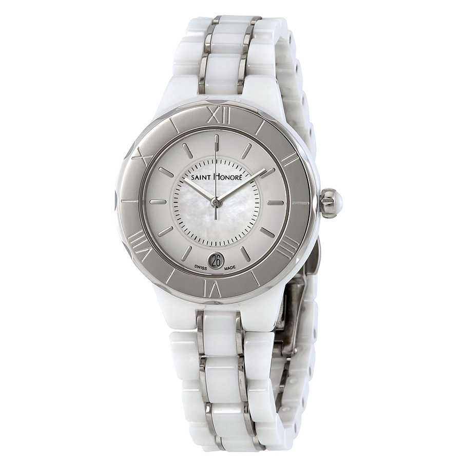 Silver-tone stainless steel case with a white ceramic bracelet. Fixed silver-tone stainless steel bezel. White mother of pearl dial with silver-tone hands and index hour markers. Dial Type: Analog. Date display at the 6 o'clock position. Quartz movement. Scratch resistant sapphire crystal. Pull / push crown. Solid case back. Round case shape. Case size: 37 mm. Deployment clasp. Water resistant at 30 meters / 100 feet. Functions: date, hour, minute, second. Casual watch style. Watch label: Swiss Made. Saint Honore Worldcode White Mother of Pearl Dial Ladies Watch 761106 71BYIN.