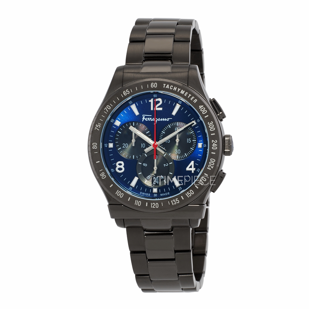 Black stainless steel case and bracelet. Bi-directional rotating black stainless steel bezel. Blue dial with silver-tone hands and index-Arabic numeral hour markers. Minute markers around the outer rim. Dial Type: Analog. Luminescent hands and markers. Date display at the 6 o'clock position. Chronograph - three sub-dials displaying: 60 second, 30 minute and 1/10th of a second. Quartz movement. Scratch resistant sapphire crystal. Solid case back. Round case shape, case size: 42 mm, case thickness: 11.25 mm. Band length: 8.5 inches. Deployment with push button release clasp. Water resistant at 30 meters / 100 feet. Functions: chronograph, date, hour, minute, second. Sport watch style. Watch label: Swiss Made. Salvatore Ferragamo Chronograph Quartz Blue Dial Mens Watch SFDK00518.