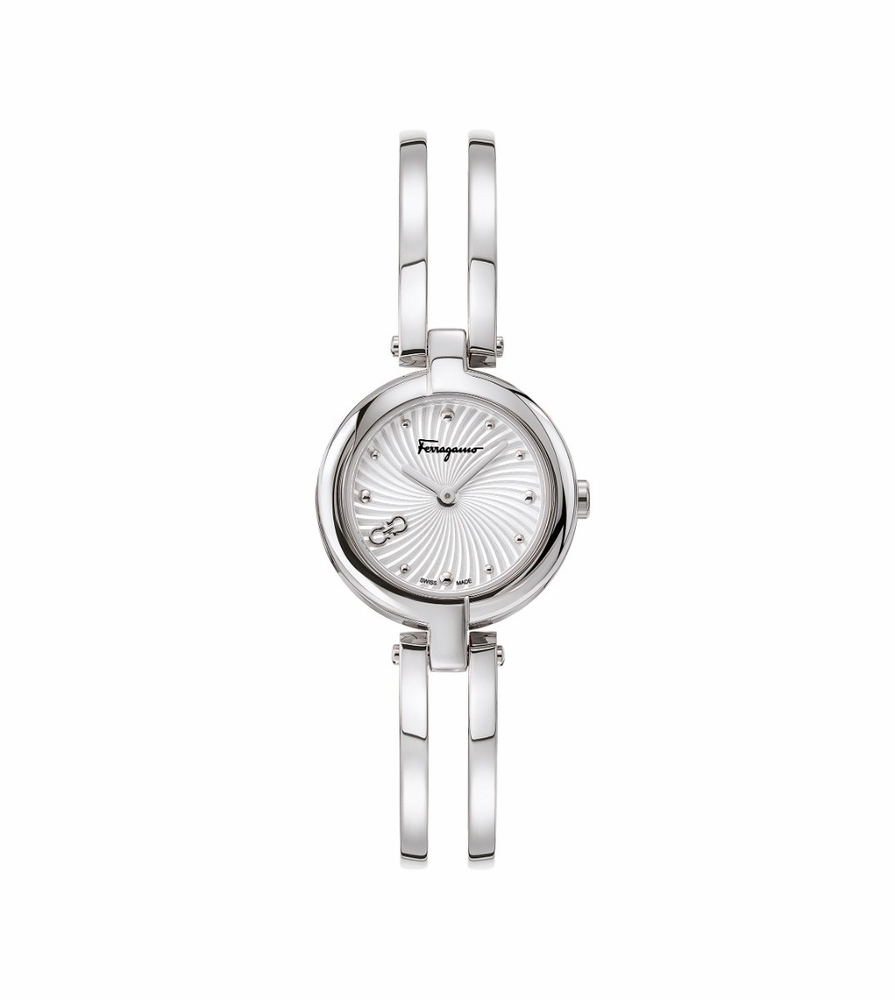Stainless steel case with a stainless steel bracelet. Fixed stainless steel bezel. White silver dial with silver-tone hands and dot hour markers. Dial Type: Analog. Quartz movement. Scratch resistant sapphire crystal. Pull / push crown. Solid case back. Round case shape. Case size: 26 mm. Case thickness: 7.5 mm. Jewelry clasp. Water resistant at 30 meters / 100 feet. Functions: hour, minute. Dress watch style. Watch label: Swiss Made. Salvatore Ferragamo Quartz White Silver Dial Ladies Watch SFAT01120.