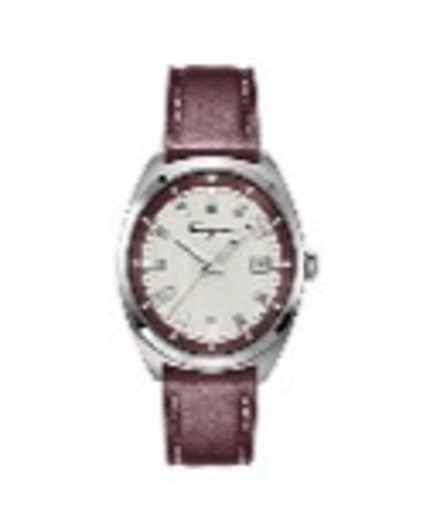 Silver-tone stainless steel case with a burgundy leather strap. Fixed bezel. Silver dial with silver-tone hands and index hour markers. Dial Type: Analog. Luminescent hands and markers. Date display at the 3 o'clock position. Quartz movement. Scratch resistant sapphire crystal. Pull / push crown. Solid case back. Round case shape, case size: 40 mm. Deployment clasp. Water resistant at 50 meters / 165 feet. Functions: date, hour, minute, second. Dress watch style. Watch label: Swiss Made. Salvatore Ferragamo Quartz Silver Dial Mens Watch SFNJ00120.