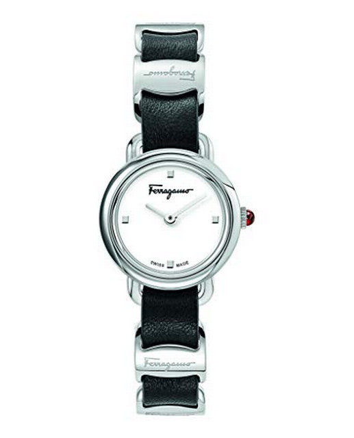 Silver-tone stainless steel case with a black leather strap. Fixed bezel. White dial with silver-tone hands. Dial Type: Analog. Quartz movement. Scratch resistant sapphire crystal. Pull / push crown. Solid case back. Round case shape, case size: 22 mm. Buckle clasp. Water resistant at 30 meters / 100 feet. Functions: hour, minute. Dress watch style. Watch label: Swiss Made. Salvatore Ferragamo Quartz White Dial Ladies Watch SFHT00120.