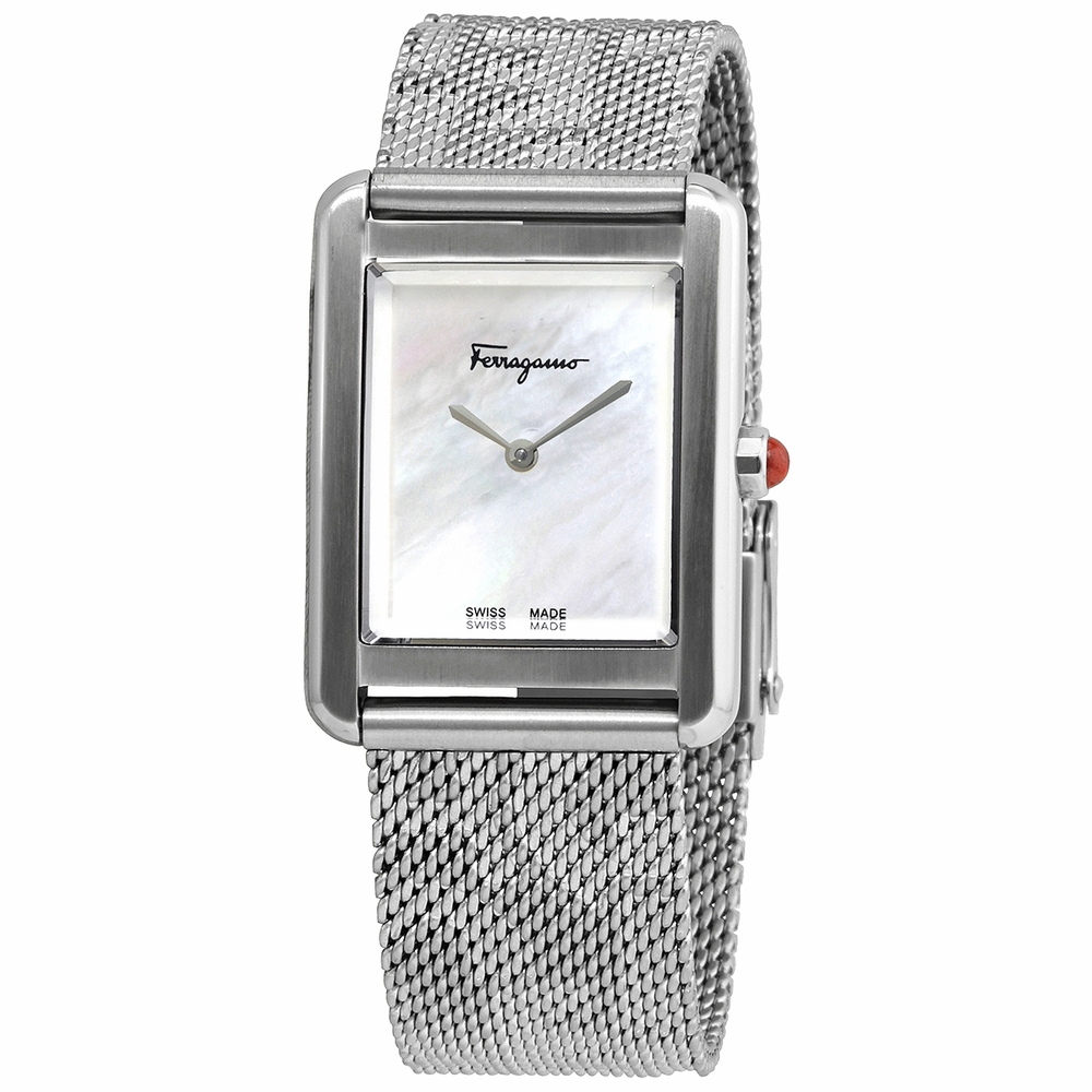 Stainless steel case with a stainless steel mesh bracelet. Fixed stainless steel bezel. Mother of pearl white dial with silver-tone sword-shaped hands. No markers. Dial Type: Analog. Quartz movement. Scratch resistant sapphire crystal. Pull / push crown. Solid case back. Rectangle case shape. Case dimensions: 24 mm x 32 mm. Case thickness: 7 mm. Band width: 18 mm. Fold over slip through clasp. Water resistant at 50 meters / 165 feet. Functions: hour, minute. Portrait Lady Series. Casual watch style. Watch label: Swiss Made. Salvatore Ferragamo Portrait Lady Quartz Ladies Watch SFDS00419.