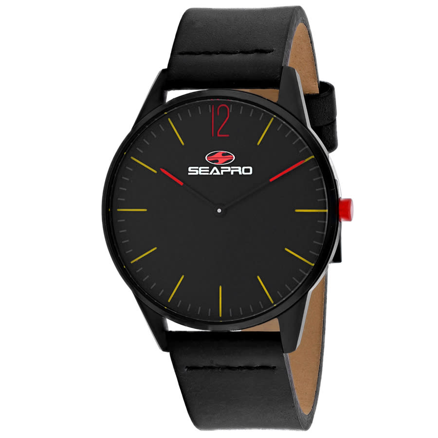 Black stainless steel case with a black leather strap. Fixed black stainless steel bezel. Black dial with black hands and index hour markers. Minute markers around the outer rim. Dial Type: Analog. Quartz movement. Scratch resistant mineral crystal. Round case shape, case size: 40 mm. Band width: 20 mm. Buckle clasp. Water resistant at 50 meters / 165 feet. Functions: hour, minute. Black Hole Series. Fashion watch style. Seapro Black hole Quartz Black Dial Mens Watch SP0100.