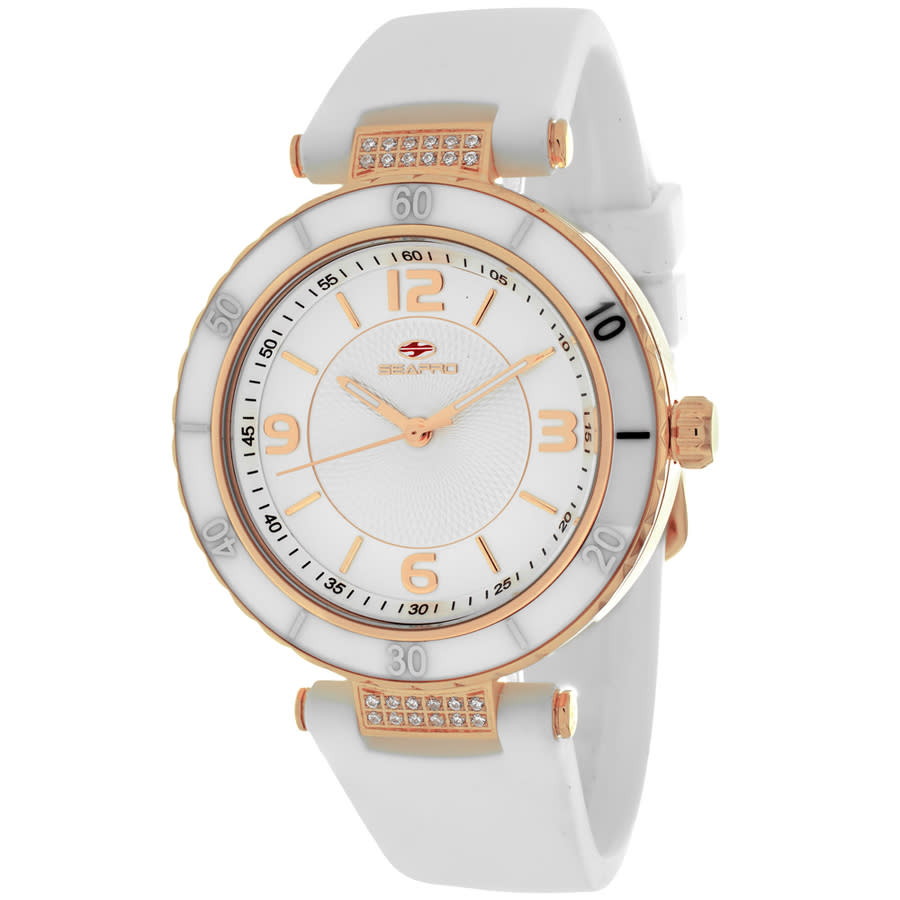 Rose gold-tone stainless steel case with a white ceramic bracelet. Fixed rose gold-tone bezel with a white ceramic inlay. Silver dial with luminous rose gold-tone hands and index hour markers. Arabic numerals appear at the 3, 6, 9 and 12 o'clock positions. Arabic numeral minute markers (at 5 minute intervals). Minute markers around the outer rim. Dial Type: Analog. Luminescent hands. Quartz movement. Scratch resistant mineral crystal. Pull / push crown. Solid case back. Round case shape. Case size: 37 mm. Case thickness: 12 mm. Band width: 18 mm. Tang clasp. Water resistant at 30 meters / 100 feet. Functions: hour, minute, second. Seductive Series. Fashion watch style. Seapro Seductive Quartz Silver Dial Ladies Watch SP6413.